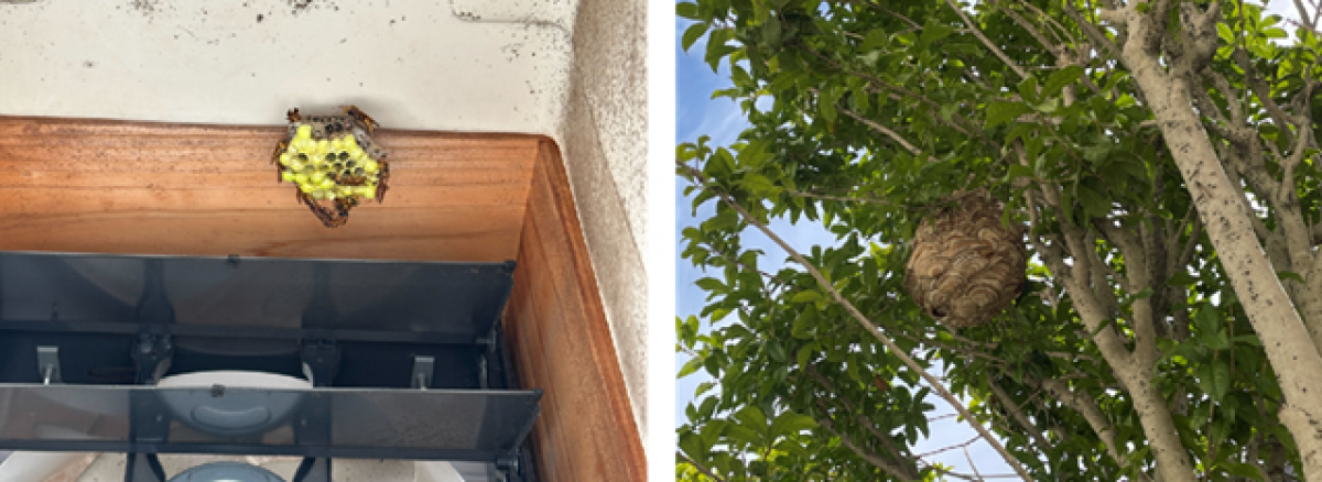 写真右) コガタスズメバチの巣。スズメバチの巣は外被膜に覆われている。