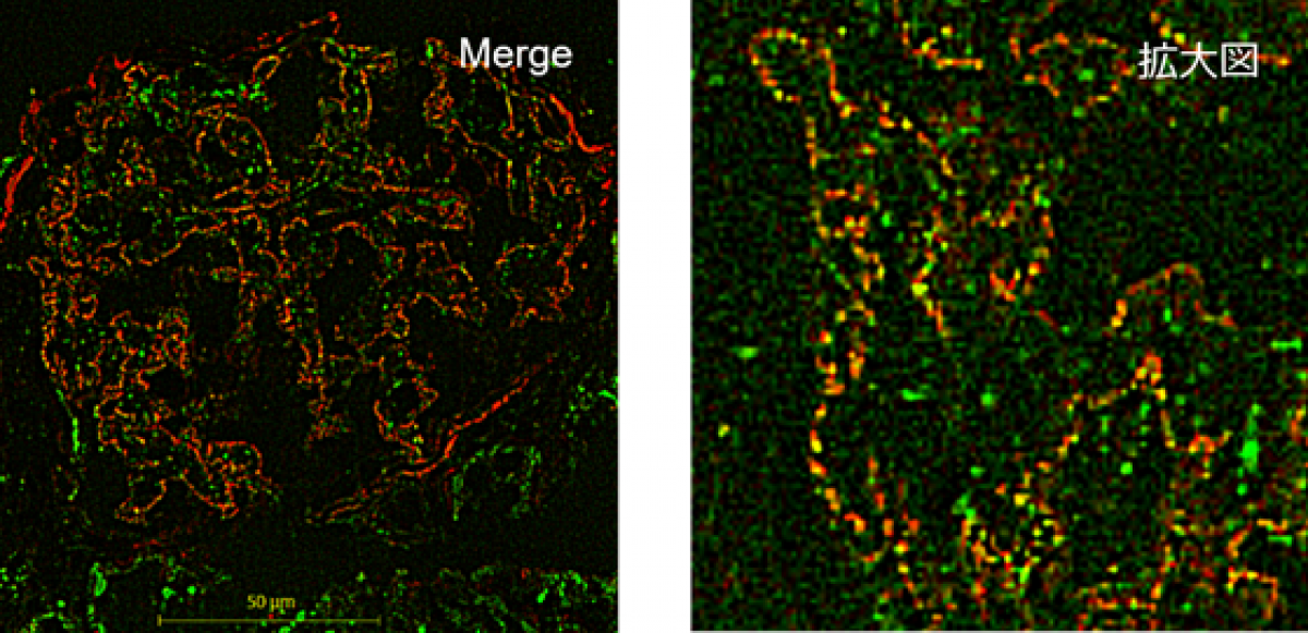腎糸球体においてネフリン(赤)にIgG(緑)が共局在(オレンジ~黄色)する様子