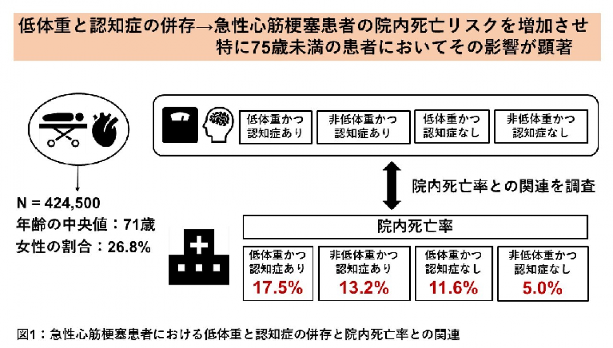 神戸大学大学院保健学研究科の石原広大博士研究員(現:甲南女子大学看護リハビリテーション学部 助教)と井澤和大准教授、大学院科学技術イノベーション研究科の山下智也教授、大学院医学研究科の平田健一名誉教授らの研究グループは、日本全国の大規模データを分析し、急性心筋梗塞患者において低体重(BMI 〈体格指数〉が18.5kg/m2未満)と認知症が重なると院内死亡率を増加させることを明らかにしました。院内死亡率は、「低体重かつ認知症あり」群が最も高く17.5%、次いで「非低体重かつ認知症あり」群が13.2%、「低体重かつ認知症なし」群が11.6%、最も低かったのは、「非低体重かつ認知症なし」群の5.0%でした。また、75歳未満においては、両者の組み合わせによる影響が特に顕著であることも示されました。高リスク患者をいち早く発見し、迅速かつ適切なケアを提供することで、急性心筋梗塞患者における死亡率のさらなる低下や入院期間の短縮が期待されます。このアプローチにより患者の予後が向上するだけでなく、効率的で持続可能な医療体制の発展へとつながる可能性があります。