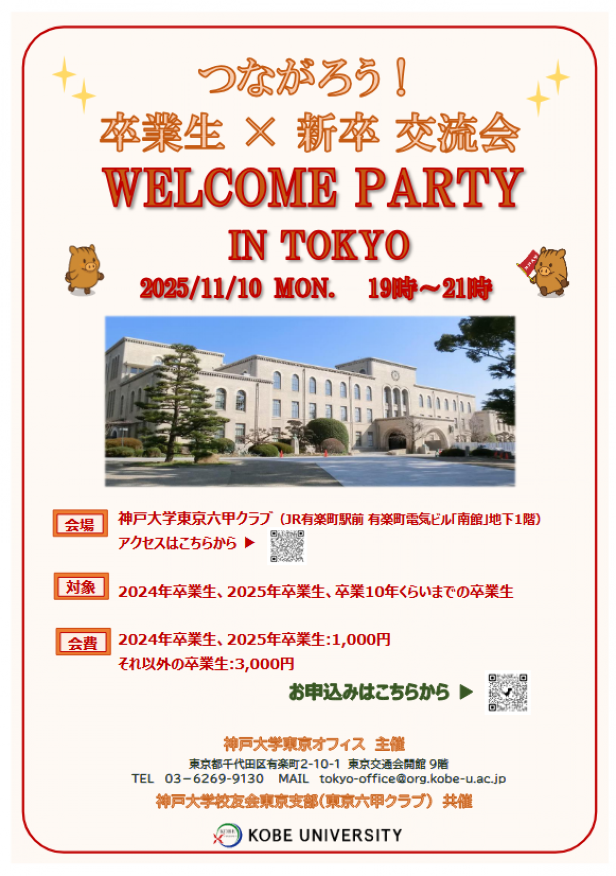 神戸大学東京オフィス主催、神戸大学校友会東京支部(東京六甲クラブ)共催により、東京地区在住の2025年卒および2024年卒の神戸大学卒業生を対象とした歓迎会を開催します。今回が初の開催となりますので、2024年卒の皆さまも歓迎の対象とします。