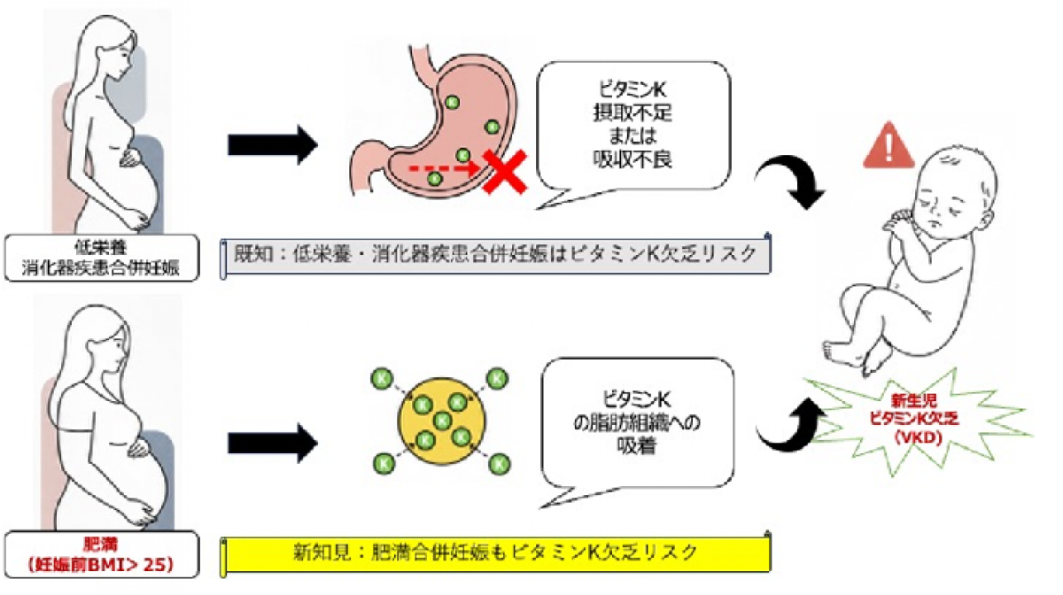 神戸大学大学院医学研究科小児科学分野の増田祐大学院生、神戸大学医学部附属病院総合周産期母子医療センターの芦名満理子助教、神戸大学大学院医学研究科小児科学分野(こども急性疾患学部門)の藤岡一路特命教授らの研究グループは、母体の妊娠前肥満(BMI25以上)が、新生児におけるビタミンK欠乏の独立した危険因子であることを明らかにしました。今後、妊娠前肥満例に対する周産期でのビタミンK評価や補充戦略の有効性を検証することで、新生児ビタミンK欠乏性出血の予防につながることが期待されます。