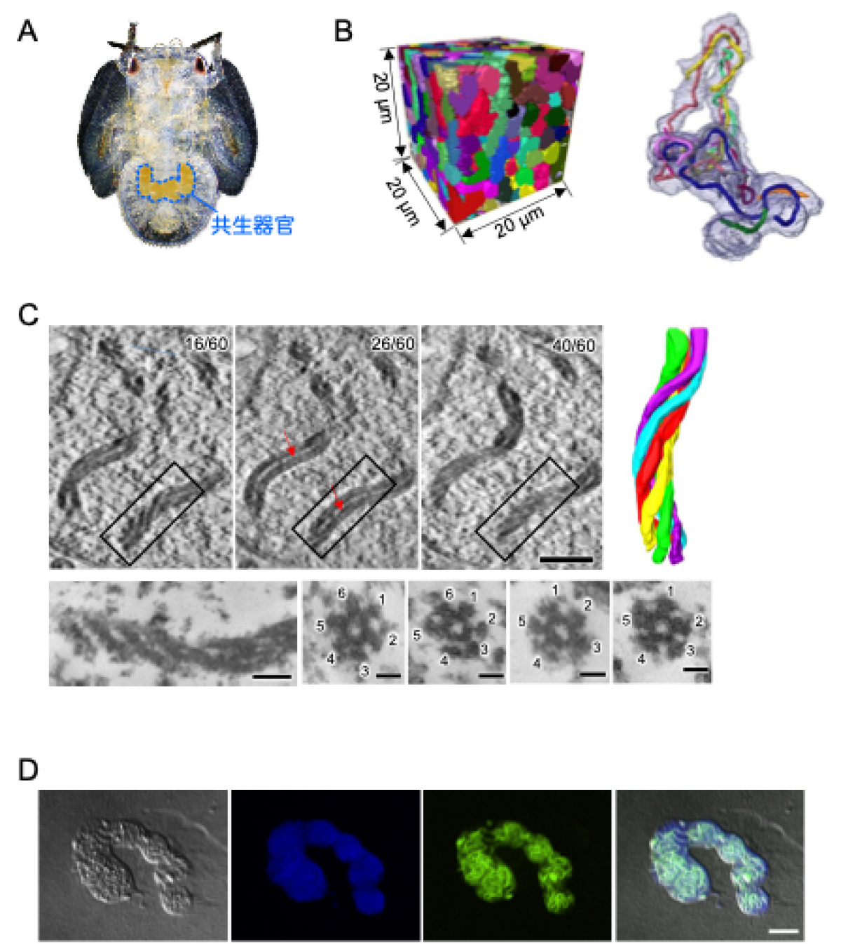 豊橋技術科学大学の中鉢淳 准教授、韓国・釜山大学の宋致宖 助教授、生理学研究所の村田和義 特任教授、神戸大学の洲﨑敏伸学術研究員らによる国際研究チームは、世界的なカンキツ害虫であるミカンキジラミに共生する細菌「プロフテラ」から、生物界に前例のない新たな管状構造を発見しました。この成果は、チームが多様な顕微鏡技術を駆使して明らかにしたもので、害虫防除の新たな戦略に加え、生命進化の研究にも大きな展開をもたらす可能性があります。