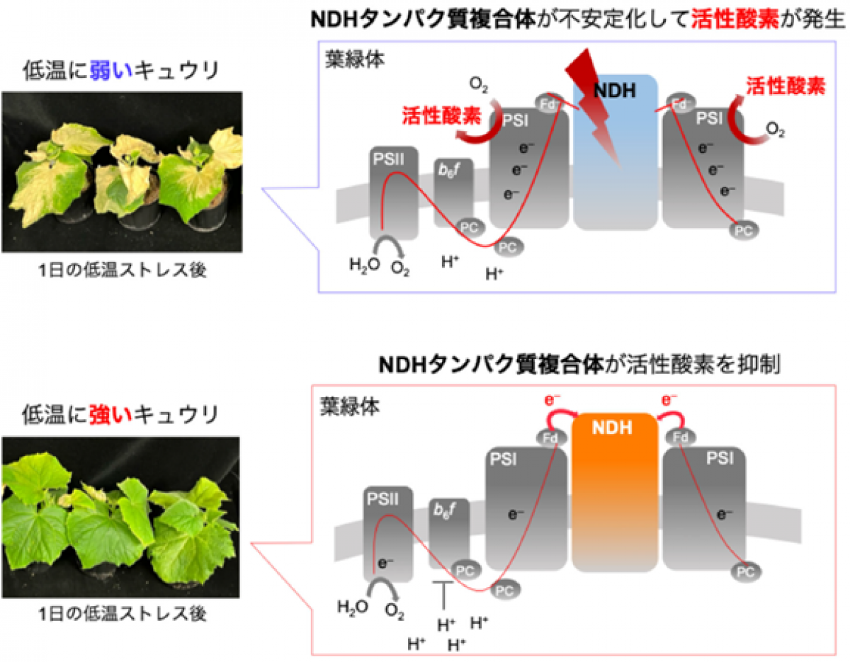 気候変動が進む中、作物の温度耐性を支えるメカニズムの解明が求められています。低温ストレスは、キュウリなどの夏作物の光合成を阻害して生育を低下させますが、その詳細なメカニズムは不明でした。京都大学大学院農学研究科 伊福健太郎 教授、竹内航 同博士後期課程学生、播本慎太郎 同修士課程学生、神戸大学大学院農学研究科 三宅親弘 教授らの研究グループは、葉緑体にある「NDH複合体」の分解がキュウリの低温ストレス障害のトリガーであることを明らかにしました。低温に弱いキュウリ品種では、低温ストレス時にNDHが分解され、光合成の阻害と葉の白化が起こりました。一方、低温に強いキュウリ品種ではNDHは低温でも安定で、葉緑体は活性酸素から安全に守られました。これまで環境ストレス時のNDHの機能は明らかになっていませんでしたが、低温ストレス時に活性酸素を抑制し、葉緑体を健康に保つという重要な生理学的役割がはじめて明らかとなりました。