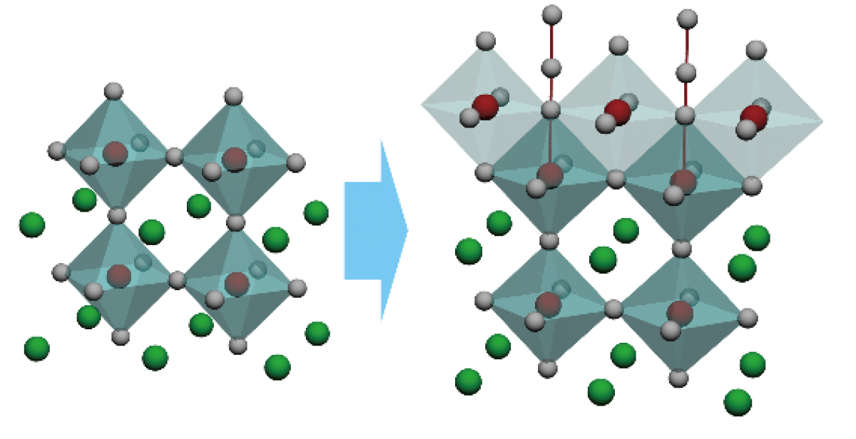 図1. (左)真空中での La0.6Sr0.4CoO3薄膜の表面構造。CoO6八面体が頂点共有した構造である。図の下側が電極内部,上側が外部である。(右)電気化学環境下でしばらく保持した後の表面構造。図の上部に辺共有の構造が形成されている。