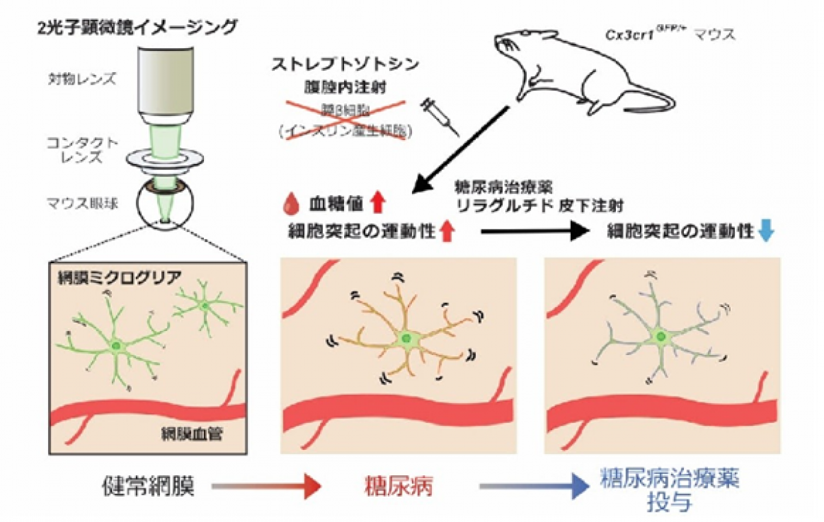 神戸大学大学院医学研究科の橘吉寿准教授、曽谷尭之大学院生、楠原仙太郎講師、中村誠教授からなる研究グループは、マウスの網膜を生きたまま高解像度で観察できる新しい技術を開発しました。今回、2光子顕微鏡という特殊な顕微鏡を用いることで、従来の技術では捉えられなかった糖尿病網膜症における網膜ミクログリアの過剰な活動をリアルタイムで確認することに成功しました。さらに、糖尿病や肥満の治療薬として使用されているGLP-1受容体作動薬リラグルチドを投与すると、この異常なミクログリアの活動が正常化されることも明らかになりました。