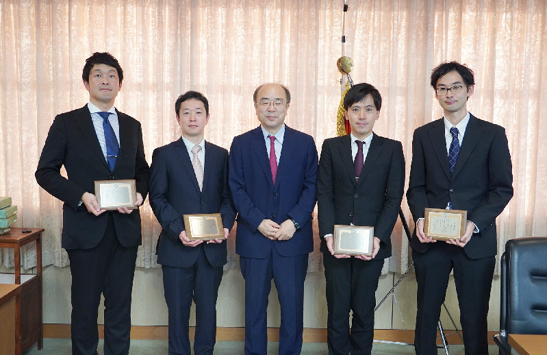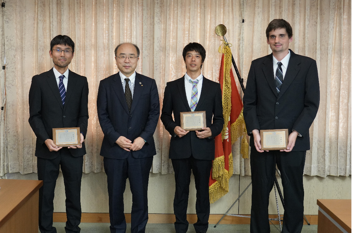 各学系長から推薦を受けた若手研究者の中から、論文・著書の成果、受賞歴、外部資金獲得状況や社会貢献といった業績を評価した結果、7名の受賞者が選ばれ、藤澤学長より表彰されました。また、受賞者には研究費が併せて授与されました。