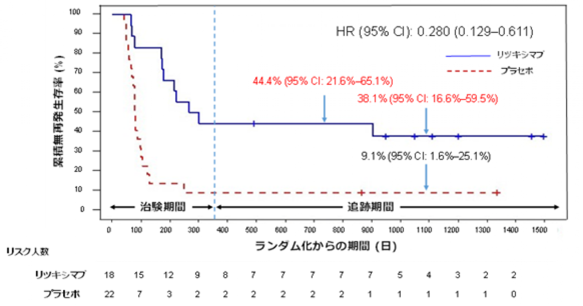 神戸大学大学院医学研究科内科系講座小児先端医療学分野(連携大学院)の飯島一誠客員教授(兵庫県立こども病院長)、国立成育医療研究センター臨床研究センターの佐古まゆみ研究推進部門長、神戸大学大学院医学研究科内科系講座小児科学分野の野津寛大教授、堀之内智子講師を中心とする小児腎臓病研究グループは、難治性に至っていない(=免疫抑制薬未使用の)小児頻回再発型/ステロイド依存性ネフローゼ症候群(FRNS/SDNS)を対象として、Bリンパ球表面抗原CD20に対するモノクローナル抗体であるリツキシマブの有効性・安全性を検証する「多施設共同二重盲検プラセボ対照ランダム化比較試験」の被験者の長期追跡調査を行ったところ、リツキシマブ群の累積無再発生存率は、プラセボ群に比して明らかに高いことを見出しました。また、同様のランダム化比較試験のシステマテイックレビュー及びメタ解析注5を行ったところ、リツキシマブ投与36ヵ月後までは、リツキシマブ群はコントロール群に比して統計学的有意に無再発生存率が高いことを明らかにしました。以上より、難治性に至っていない小児FRNS/SDNS患者に対するリツキシマブは、比較的高い頻度で長期寛解を誘導する可能性があり、今後、リツキシマブの積極的な使用により小児FRNS/SDNS患者の長期予後の改善が期待されます。