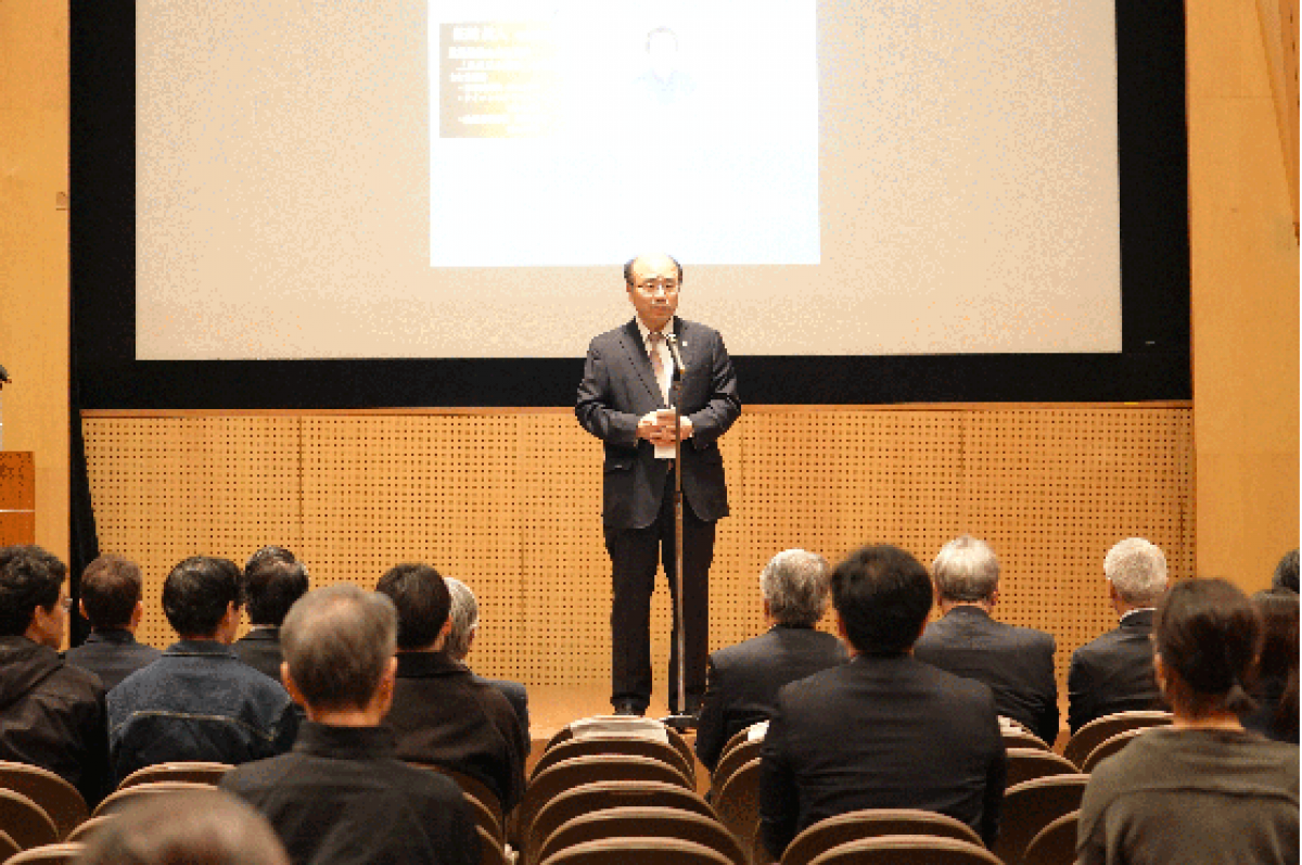 出光佐三記念六甲台講堂で開かれた懇談会では、名誉教授、役員・部局長の計43名が参加しました。司会より、新たに名誉教授になられた方の紹介、叙勲受章者の紹介が行われた後、藤澤正人 学長より、挨拶および大学の現況について報告が行われました。
