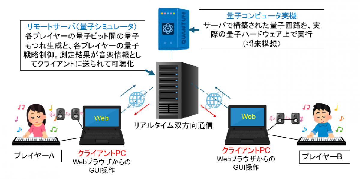 神戸大学大学院工学研究科の相馬聡文准教授は、量子コンピューティングと音楽情報科学、認知科学を融合した研究として、量子ゲーム理論を応用し、音楽演奏を通じて量子的な相互干渉確率構造をもつ意思決定を体験できる世界初のブラウザベース音響システムの開発に成功しました。プレイヤーはインターネットを介して二人一組でセッションに参加し、それぞれが鍵盤を打鍵すると、両者の戦略(協調・対抗)に基づく量子もつれ状態の測定結果に応じて、互いの音の高さが確率的に変化します。これにより、「意思決定の揺らぎ」や「相互干渉」を聴覚的に体験できる新しい音楽表現システムが実現しました。