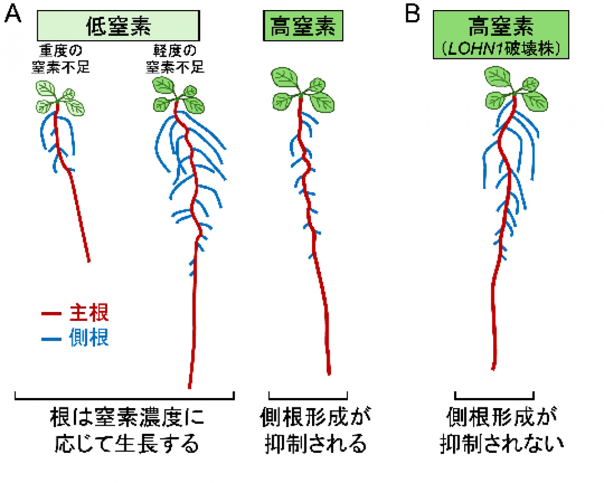 植物は土壌中の窒素濃度に応じて根の構造を大きく変化させます。窒素が豊富な環境では「窒素が十分に存在する」と判断し、不要なエネルギー消費を避けるために根の生長を抑制することが知られていましたが、その詳細なメカニズムはこれまで不明でした。