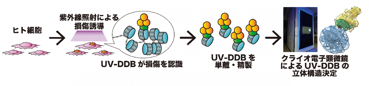 東京大学定量生命科学研究所の松本翔太助教、胡桃坂仁志教授ら、神戸大学バイオシグナル総合研究センターの菅澤薫教授、大阪大学大学院基礎工学研究科の岩井成憲名誉教授、山元淳平准教授の研究グループは、細胞内でゲノムDNA上の紫外線損傷を修復中のUV-DDBタンパク質複合体の立体構造を可視化することに成功しました。