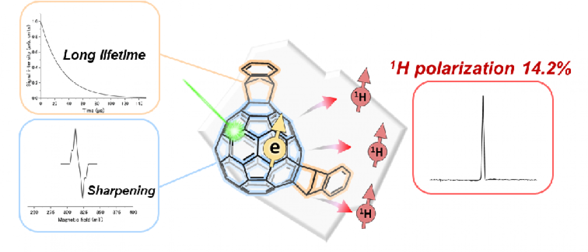東京大学大学院理学系研究科の坂本啓太大学院生、濱地智之大学院生(現 九州大学先導物質化学研究所 助教)、楊井伸浩教授らの研究グループは、京都大学大学院理学研究科の御代川克輝大学院生、倉重佑輝准教授、京都大学大学院工学研究科の今堀博教授、理化学研究所開拓研究所および仁科加速器科学研究センターの立石健一郎研究員、上坂友洋主任研究員・兼部長、神戸大学分子フォトサイエンス研究センターの小堀康博教授らと共同で、トリプレットDNPの新規偏極源分子としてフラーレン誘導体の開発を行うことで、高効率なトリプレットDNPを実現しました。