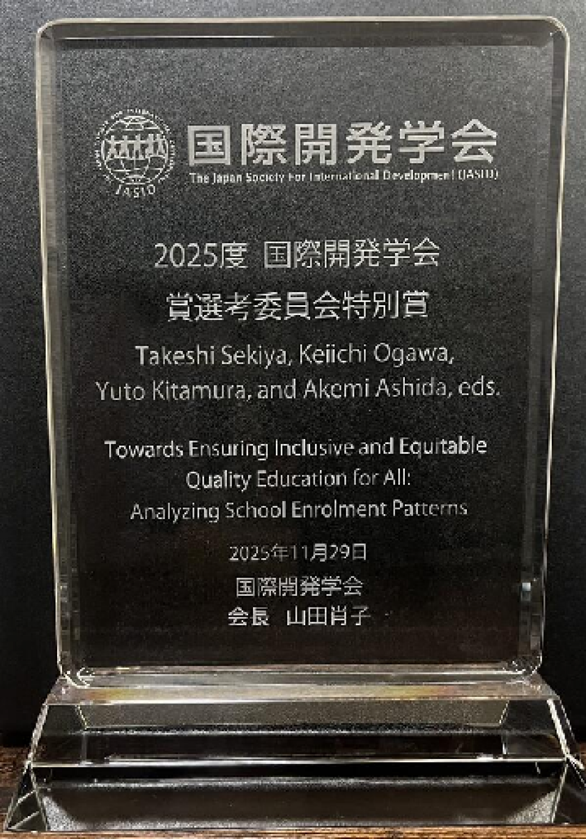 11月 29・30日に広島大学で開催された国際開発学会第 36回全国大会において、神戸大学大学院国際協力研究科の小川啓一教授による共編著『Towards Ensuring Inclusive and Equitable Quality Education for All: Analyzing School Enrolment Patterns』が「賞選考委員会特別賞」を受賞しました。