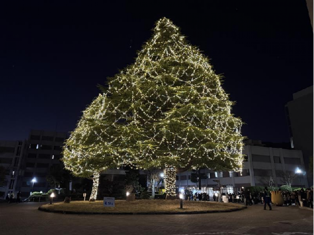 12月6日、神戸大学六甲台第2キャンパスにて「神戸大学イルミネーションプロジェクト」点灯式を開催し、教職員・学生など約300名が集まりました。文・理・農学研究科付近のロータリーに立つヒマラヤスギが、学生・教職員数に相当する約2万灯のLEDにより幻想的にライトアップされ、キャンパスは光と音楽に包まれました。